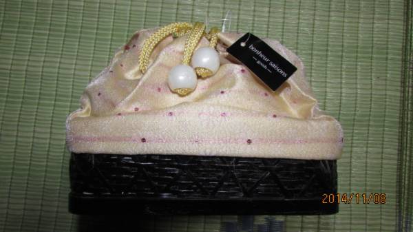 - (着物屋・蔵出し)(未使用花模様織り出し竹籠巾着)レトロ