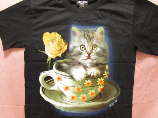 - 横浜最新 可愛い猫とカップとバラTシャツ M 送料無料 ξtsξanξ23s
