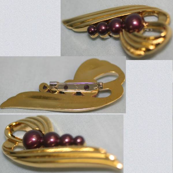 - 音符の記号の様なデザイン金色濃い紫色フェイクパール付ブローチ ○B9-176-1
