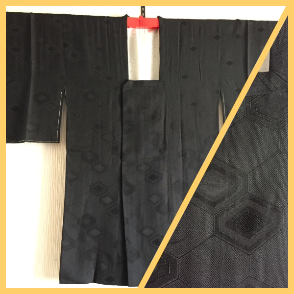 - 【黒道行コート】正絹 袷 コート丈87cm 漆黒 亀甲の紋意匠縮緬
