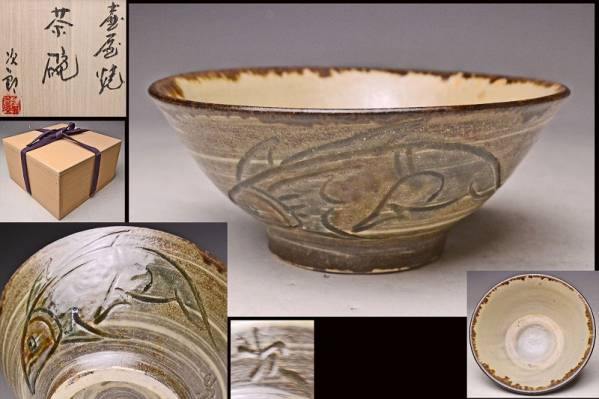 - 金城次郎 ★ 双魚文茶碗 ★ 共箱 ★ 人間国宝 ★ 検 浜田庄司 小橋川仁王 ★