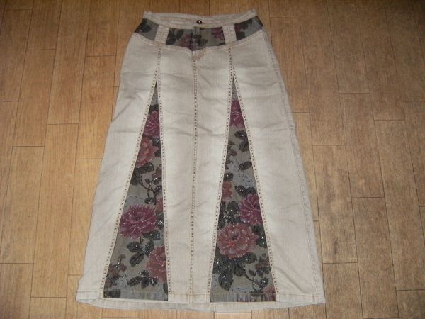 - 昭和レトロ★インデイアン風 デニムスカート★ビーズ刺繍 花柄
