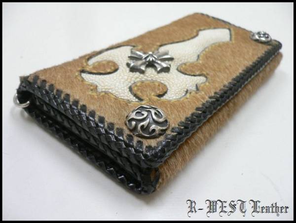 - 牛革×本ハラコ×エイ革スティングレイ白クロス レザーウォレット茶毛/silver925十字架付き