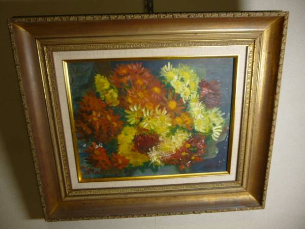 - 旧家から 古い油絵 仮題「花々」 作者不詳サイン有 (Y NANO)ボード F6号 額装
