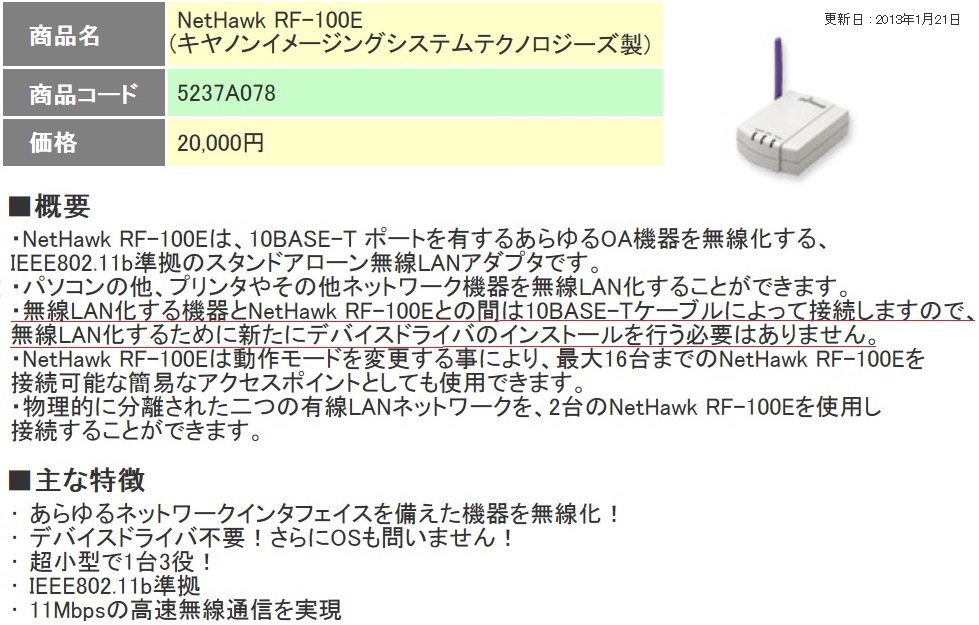 - ◎即決◎ Canon 無線LANアダプタ 【希少】Net Hawk RF-100E ♪ドライ不要、OS問わず:簡単に無線化♪