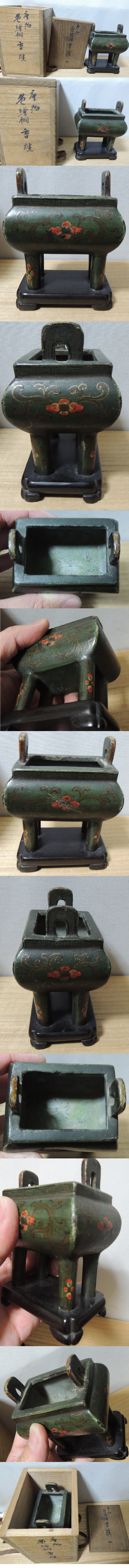中国 明代 色絵銅 香炉 彩漆宣徳銅 纒枝蓮紋 万字紋 共箱 中国古玩