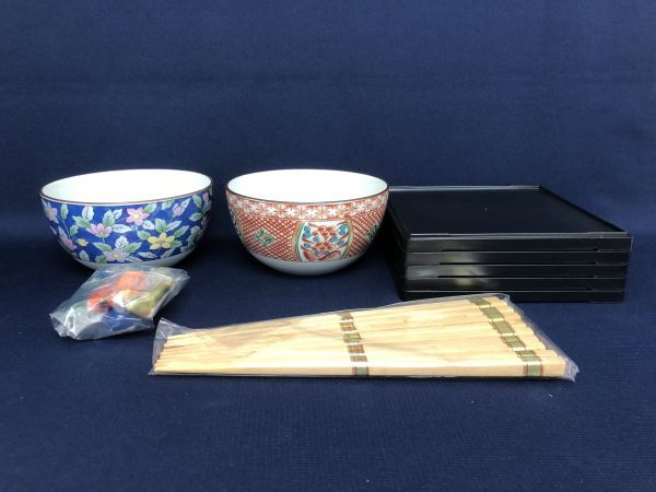 - 未使用品★ 三洋陶器 染付赤絵 箸 箸置き 丼 揃 お盆つき 箱あり管理1805 M-1
