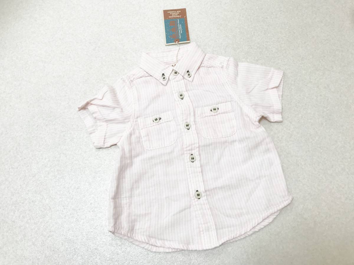 > べべ【e.a.B】ガーゼ調・ピンクxホワイト・ストライプ・半袖シャツ・ブラウス 90サイズ