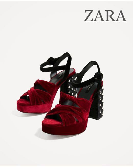 - 値下げsale!新品タグ付☆ZARAザラ☆スタッズ鋲付バーガンディー色ベロアリボンサンダル36/23.5㎝BOX入り