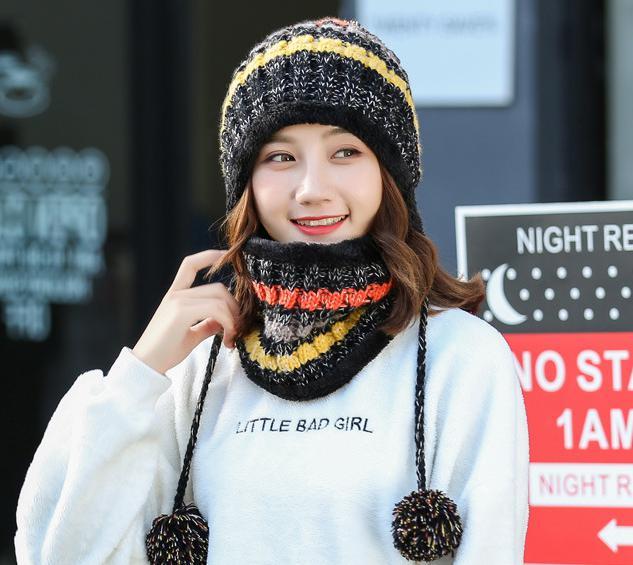 > 【新品】 ブラック ポンポン付き ニット帽 レディース 帽子 スヌード 裏ボア セットアップ キャップ 裏起毛 黒 スキー スノボ