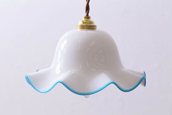 > R-039924 ヴィンテージ照明 イギリスビンテージ 水色の縁フリルが爽やかなミルクガラスペンダントライト(ランプシェード、天井照明)