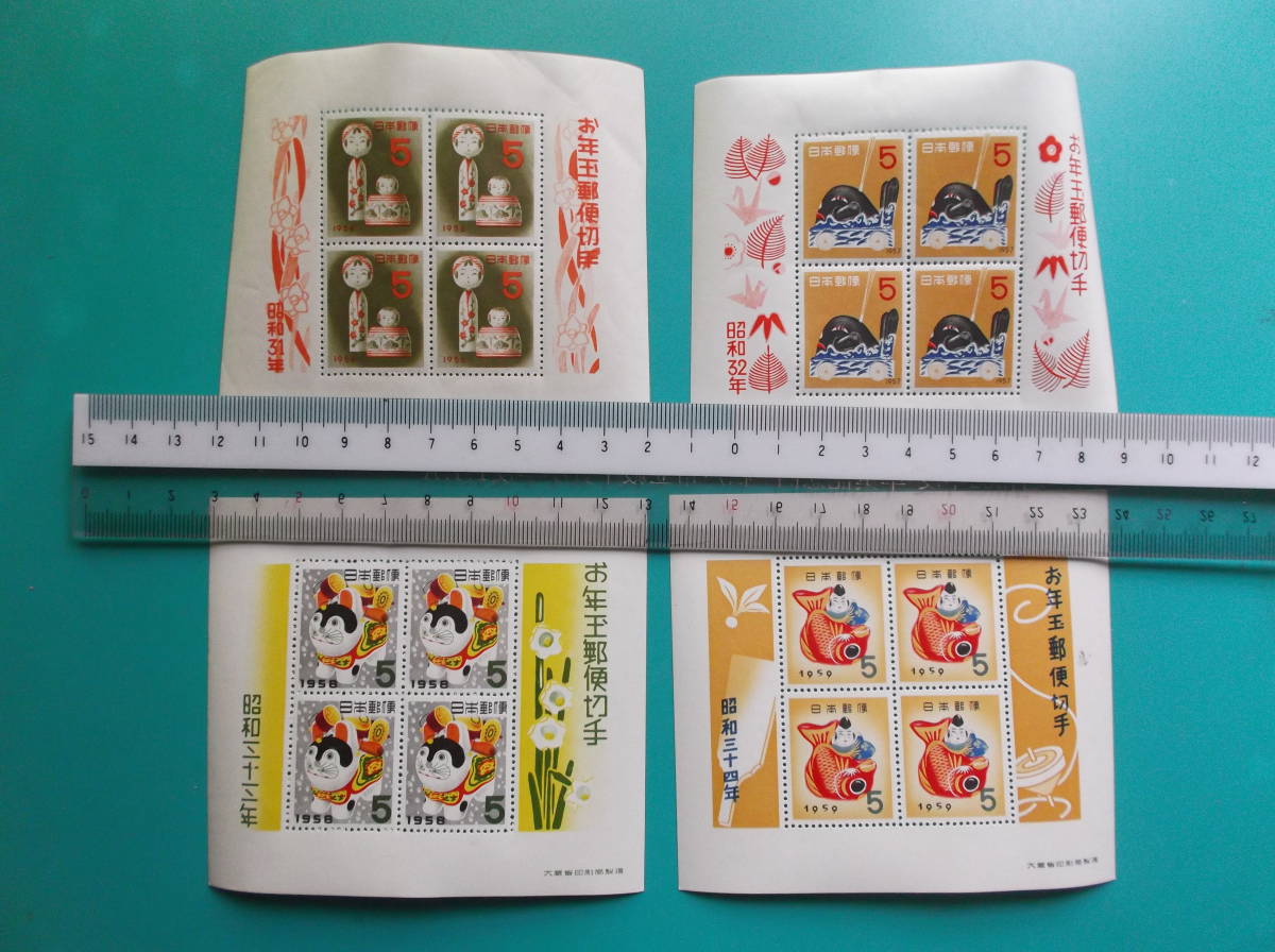 - お年玉郵便切手 小型シート 4枚組 31こけし 32だんじり 33犬はりこ 34鯛えびす