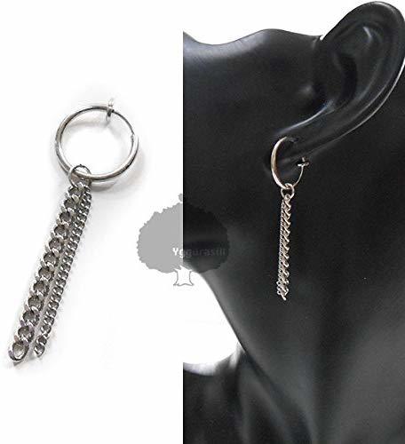 > YGG★新品 2チェーン付き フープイヤリング シルバー フェイクピアス ロング 男女兼用 バネ式 スプリング式 1個 片耳 シングル