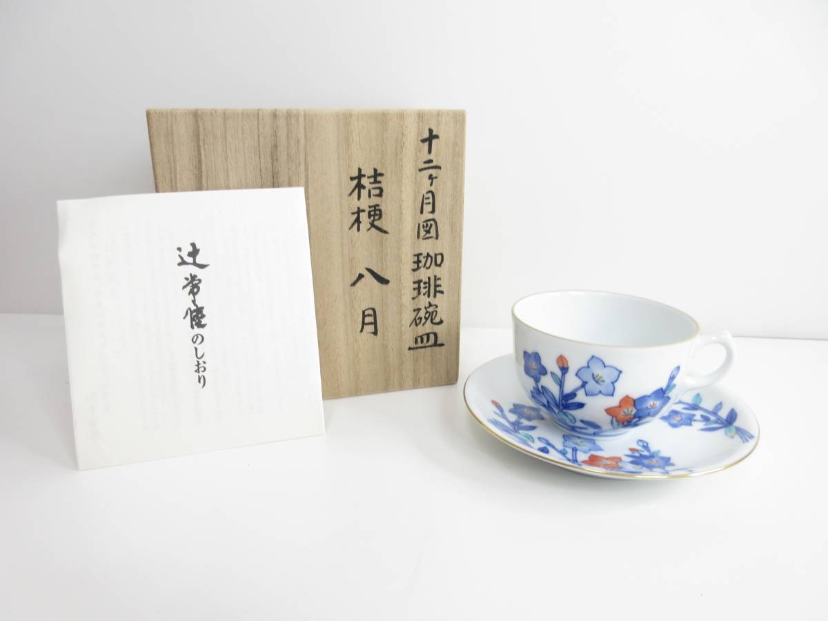 - 未使用品◆宮内庁御用達 十五代 辻常陸 十二ヶ月図 珈琲碗皿 桔梗 五月 辻家製品 禁裏御用窯元 管理2002 H-15