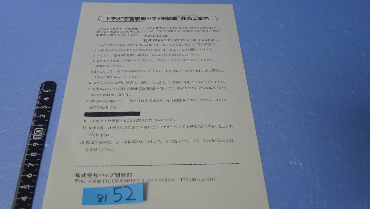 - yuk-8152(当時物)ヤマトFC本部(会員へのお知らせ)「ヤマト完結編ビデオ案内」
