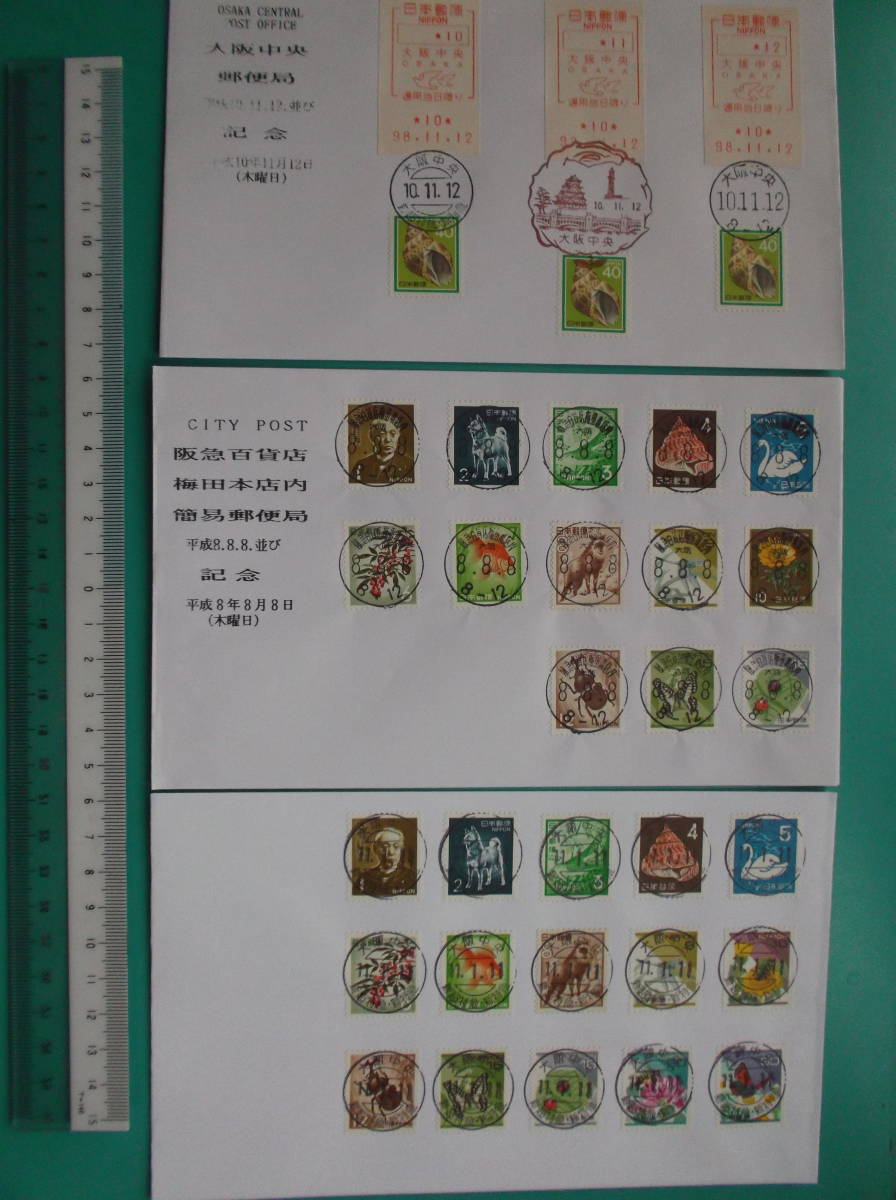 - 日連なり日並びカバー3枚組 大阪中央郵便局メータースタンプ(料金計器別納証紙)含む平成10年11月12日 阪急百貨店梅田本店内簡易 他