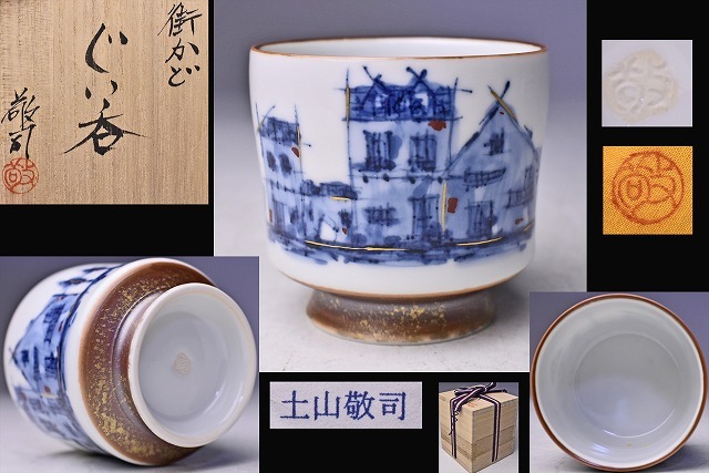> 土山敬司 ★ 街かどぐい呑 ★ 共箱共布栞 ★ 上作 ★ 呉須金彩赤絵 ★ 西宮で作陶 ★ 絵画のようなセンス ★ 良いぐい呑 ★ 染付