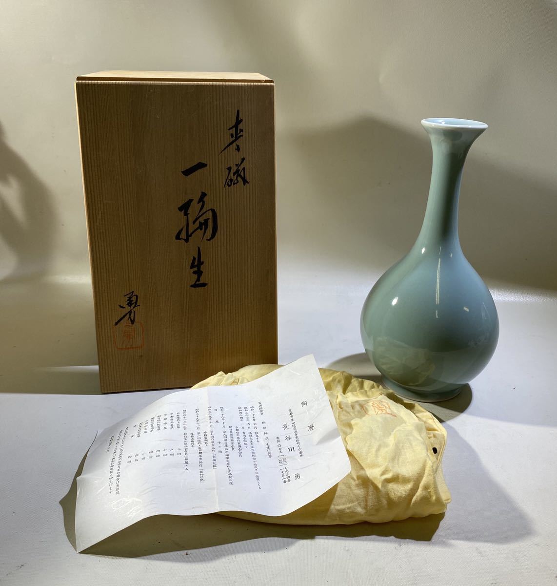 - 長谷川勇作 青磁 一輪生 花瓶 共布 共箱 西とA
