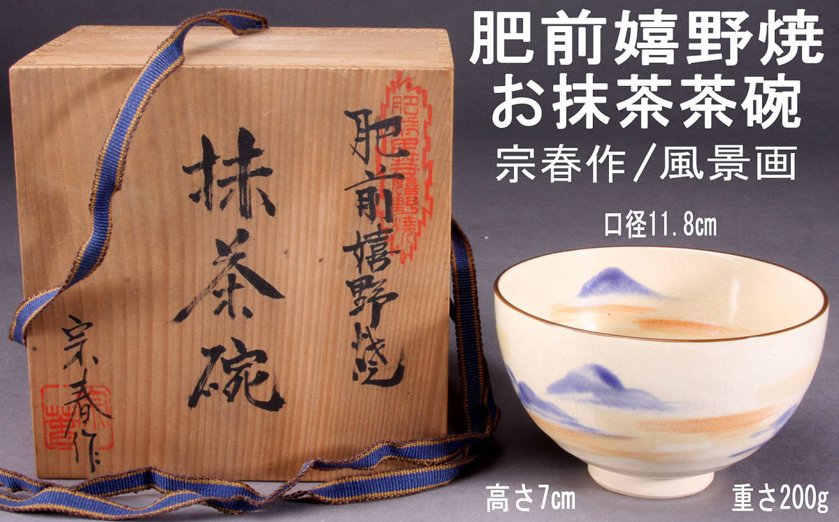 > 肥前嬉野焼 お抹茶茶碗 宗春造 風景画 口径11.8㎝ 高さ7㎝ 200g 共箱・しおり付き 経年保管品 中古 KA-7423