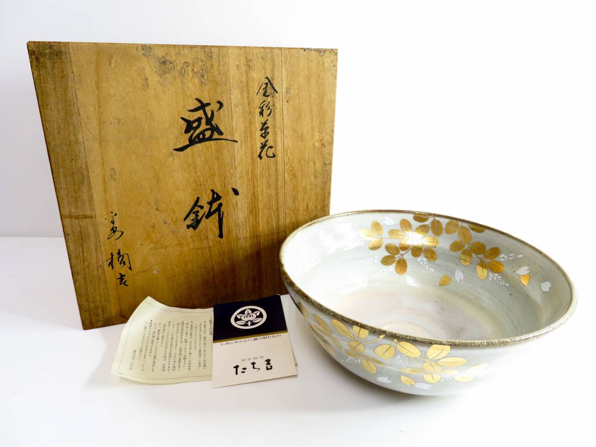 > 未使用品▲TACHIKICHI たち吉 橘吉 金彩草花 盛鉢 器 中鉢 煮物鉢 木 銘あり 木箱入 管理2007 U-4