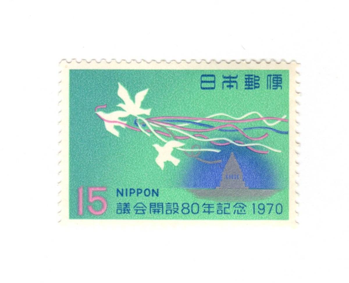 > 昭和45年1970「議会開設80周年記念/ハトと国会議事堂」15円切手・未使用【送料無料】「熊五郎の切手」00800396