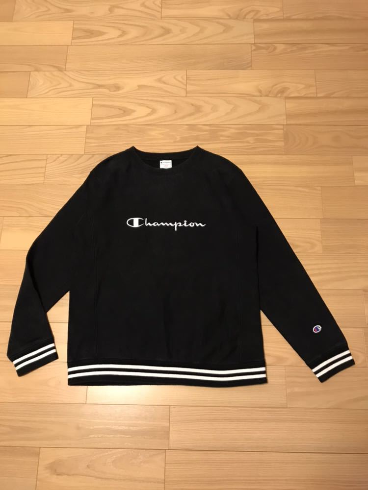 - 良品☆90s Champion/ビンテージ復刻 チャンピオン サイズL 刺繍タグ リバースウィーブ 横織スウェット BIGロゴ 希少ブラック&リブライン入