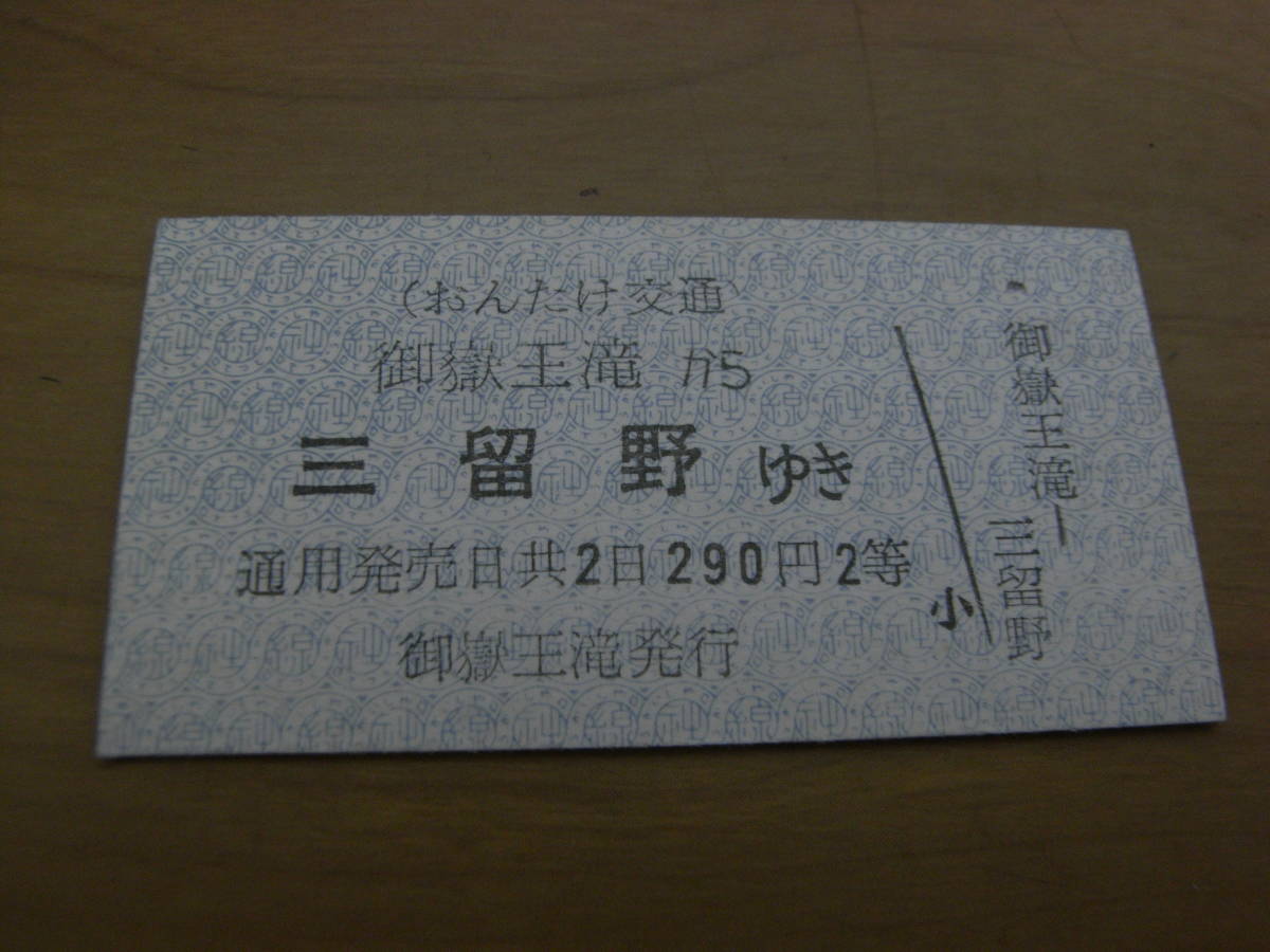 - おんたけ交通乗車券 御嶽王滝から三留野ゆき 290円 2等 御嶽王滝発行 ●三留野駅は1968年10月に南木曽駅に改称