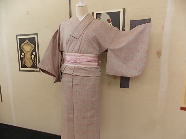 > きもの今昔16460 夏の100円バーゲン ウールのきもの 白大島のような柄相です 亀甲の中に華紋柄 虫食い有り