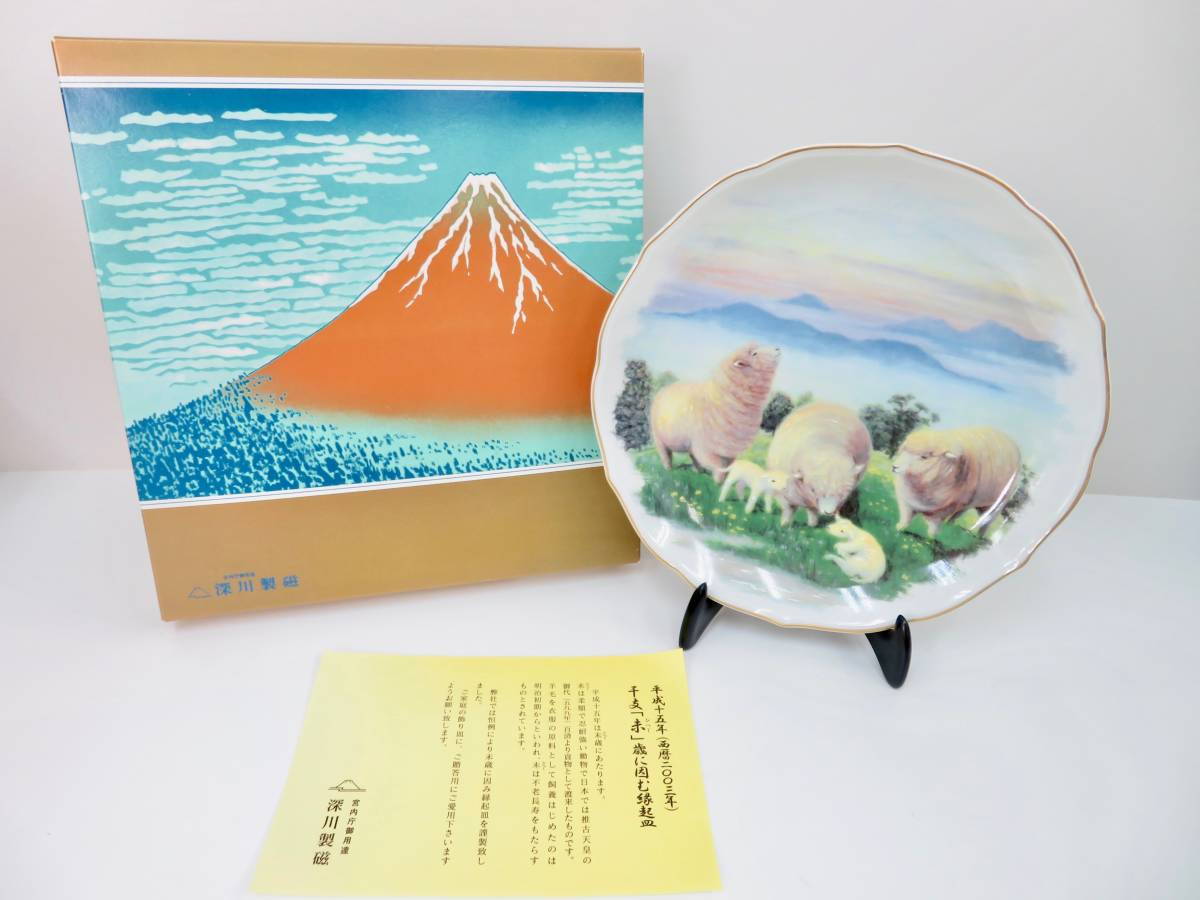 > 未使用品◆深川製磁 宮内庁御用達 縁起皿 羊 未 絵皿 置物 台付 平成十五年 2003年 干支皿 箱付 還暦祝 お祝 箱入 管理2011 Q-8
