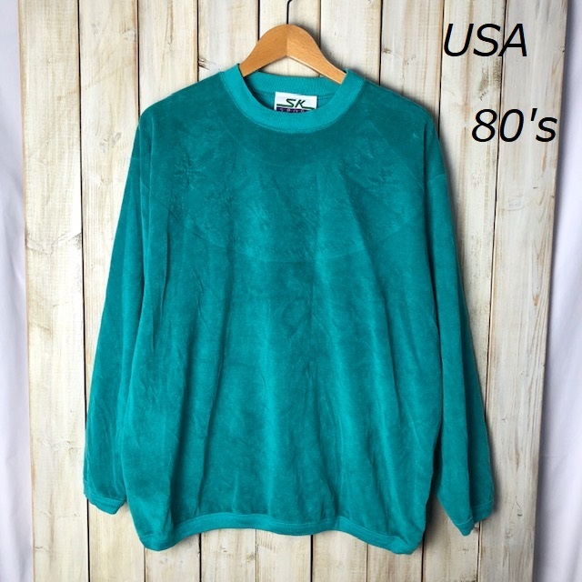 > USA古着 80s~ USA製 型押し ベロアスウェット XL 緑 オールド ヴィンテージ アメリカ古着 ベルベット カットソー ●60