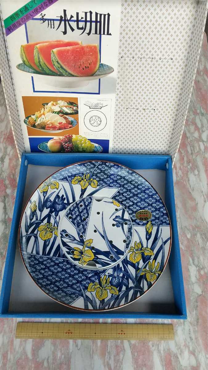 > マル美窯 丸美陶園 水切皿 菖蒲図案 サイズ【直径30㌢高さ5.5㌢重さ1200㌘】昭和レトロ 未使用 保管品 美品