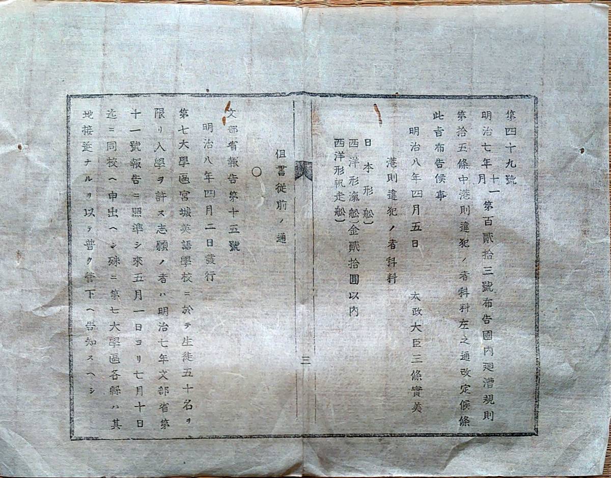 - f21012302〇明治布告 港則違反の者過料 宮城英語学校入学志願の者 明治8年〇和本古書古文書