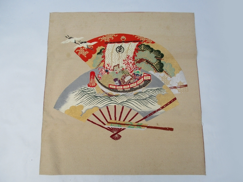 > ■大判 ふくさ扇面[松竹梅 鶴亀 扇面] ■ 家紋[笹竜胆] 宝船織 刺繍 リメイク №6928■