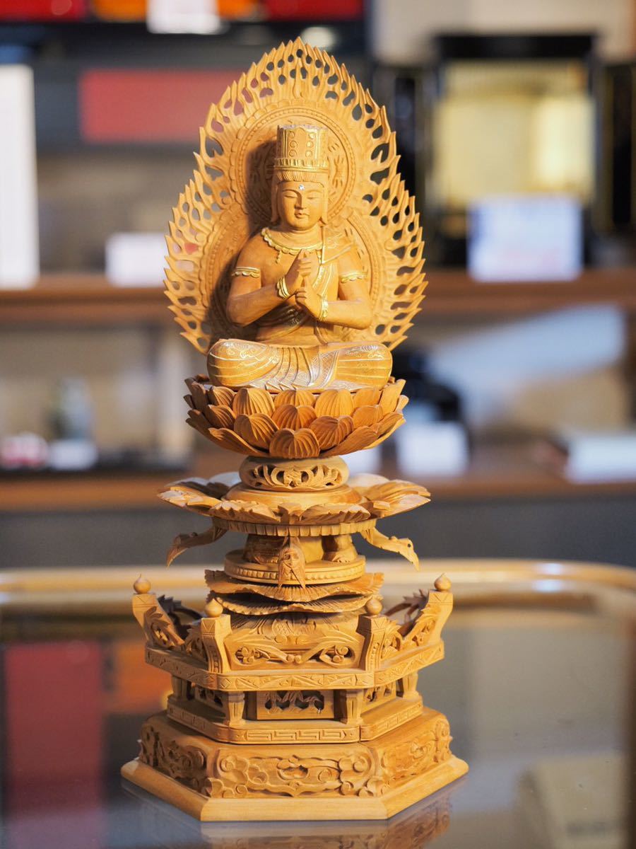 - 新品未使用 総印度白檀 大日如来 2.5寸 金泥書 六角ケマン付台座 火炎光背