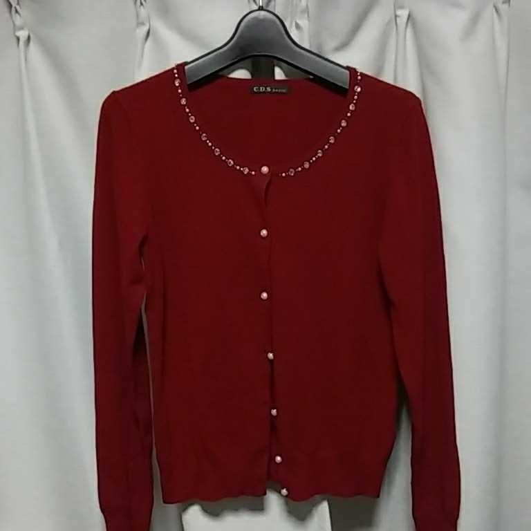 - 送料無料ビジュー付カーディガン赤M 美品/薄手