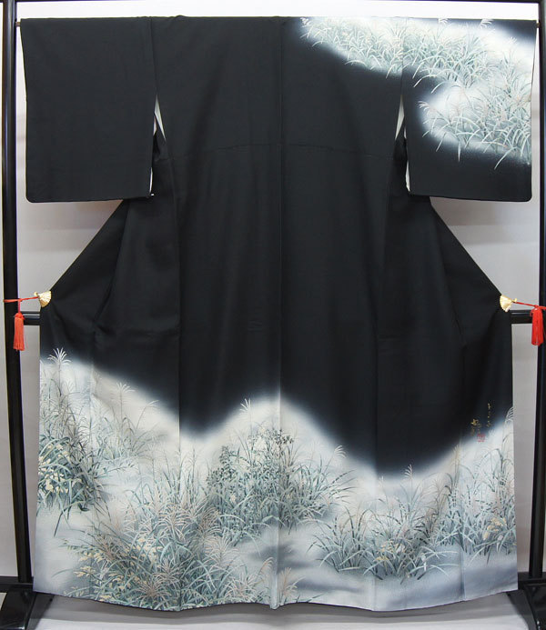 - 中古 訳あり 良品 訪問着 正絹 黒 濃紺 ススキ柄 為書きあり