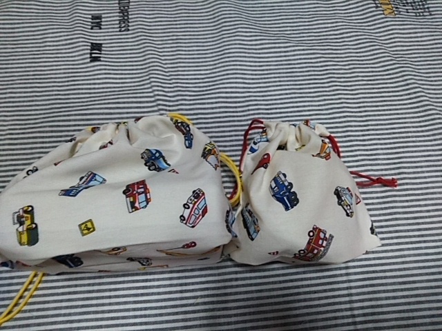 - お弁当袋コップ袋ハンドメイド薄ベージュ働く車入園準備