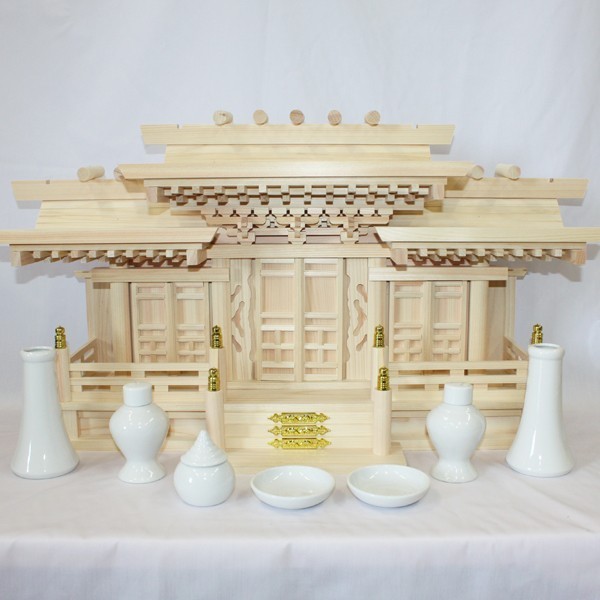 - 国産東濃桧製神棚 マス組付き唐戸三社神棚 日本製神棚 (神棚セット/神具陶器七点セット大付き)