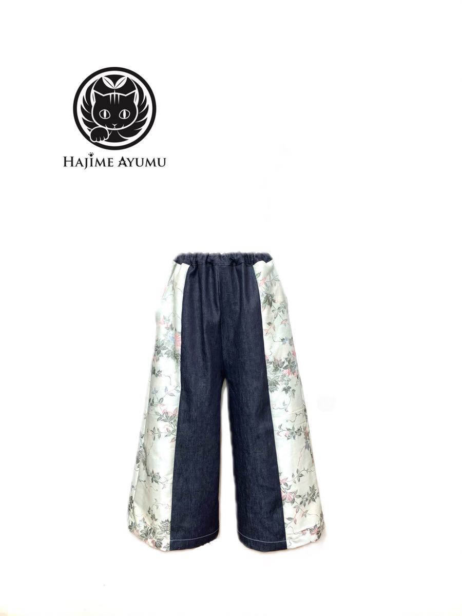 > 【現品1点限り】HAJIME AYUMU 高級和柄着物&岡山県産児島デニムリメイクデザインガウチョパンツ ハンドメイド ボトムス Freeサイズ 紺 白