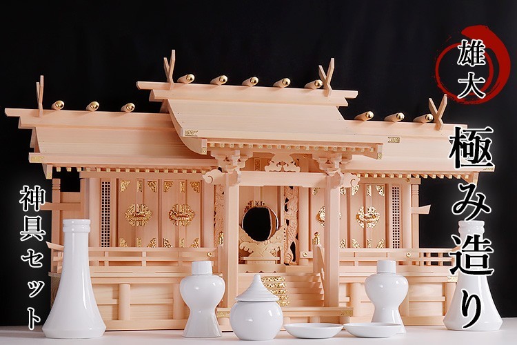 - 平安五社・大 ■ 雄大、極み造り 荘厳大社シリーズの 神棚 特々大 八幡屋根の 五社 ■ 双龍の彫刻門 ■ 神具セット