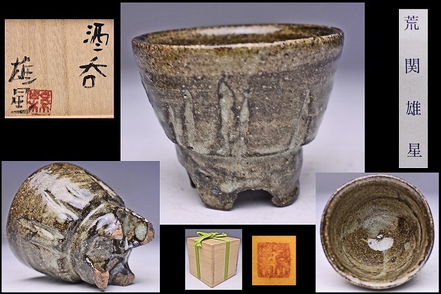 > 荒関雄星 ★ 灰釉 割高台 ぐい呑 ★ 共箱 共布 栞 ★ 4足に見える大胆な割高台が素晴らしい上作 ★ 北海道 ★ 酒器 ★ 民芸陶 ★