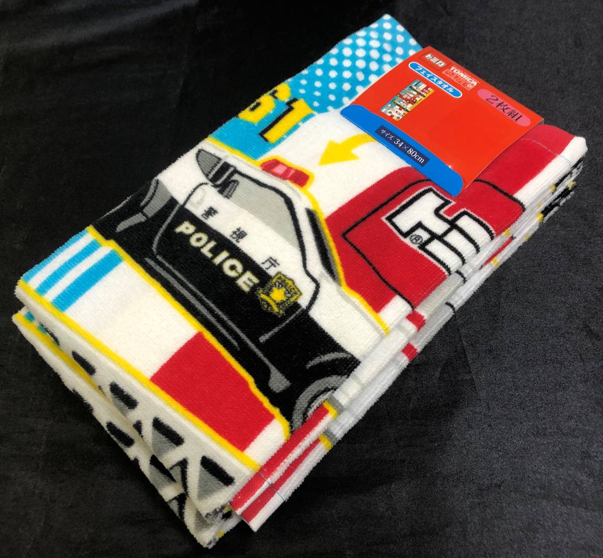 > 即決◆トミカ TOMICA◆フェイスタオル 2枚組【34×80cm】新品タグ付き 働く車 消防車 パトカー 救急車 キッズ◆