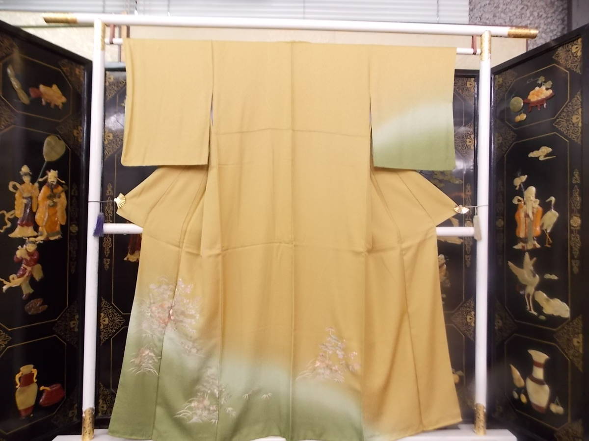 - きもの今昔2894 正絹付け下げ訪問着 ベージュ色裾わさびボカシ 総刺繍柄