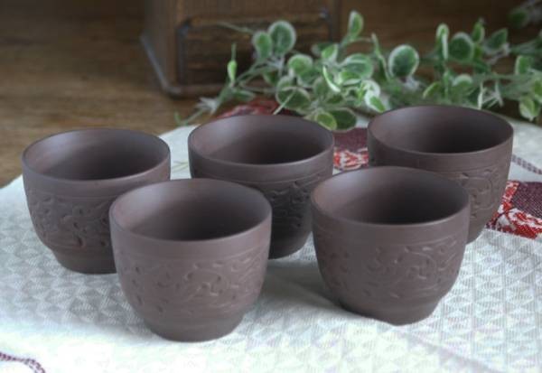 - 【民芸調】朱泥に唐草の彫 湯のみ・見茶器・ぐい飲み・猪口 5個 1000円ポッキリ
