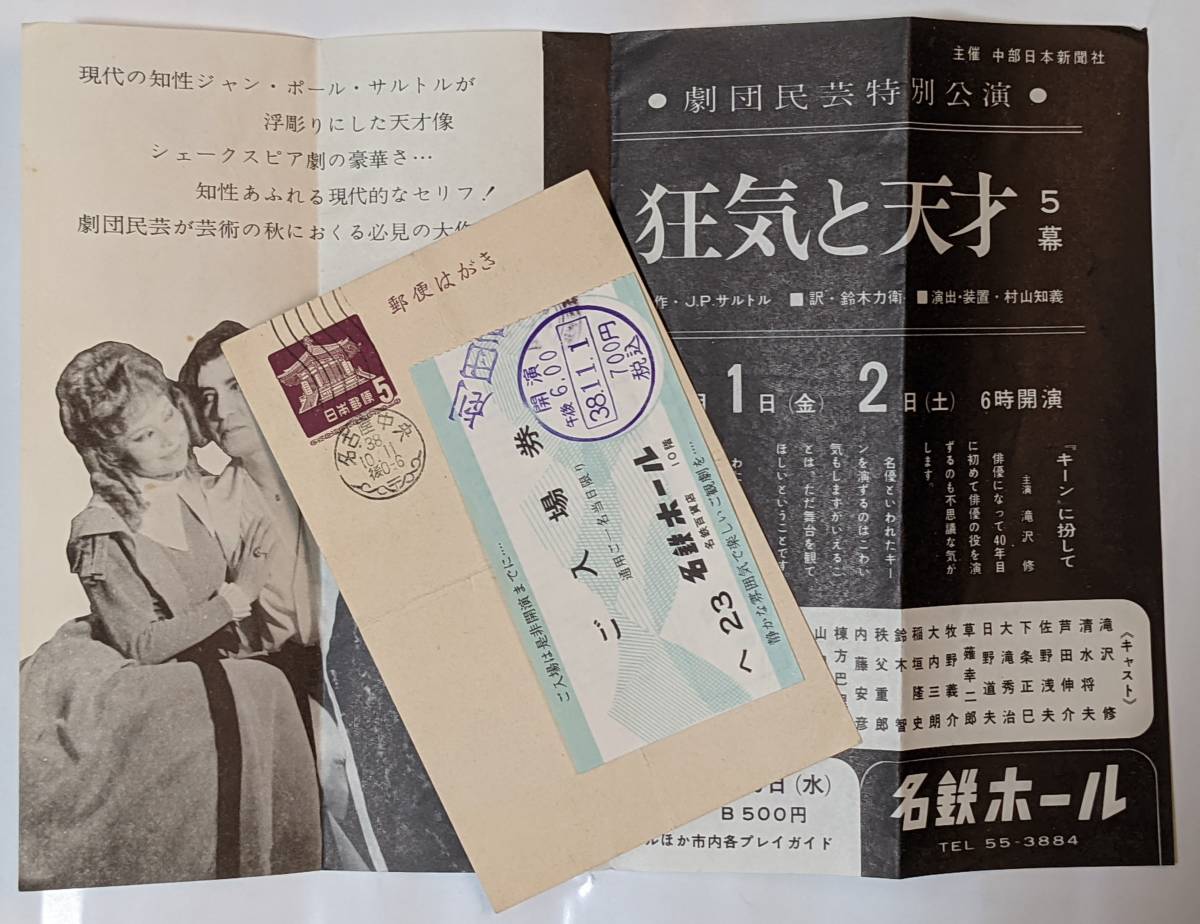 - 昭和38年11月 劇団民芸 特別公演「狂気と天才」チラシ+半券+広告郵便 滝沢修/細川ちか子 昭和レトロ
