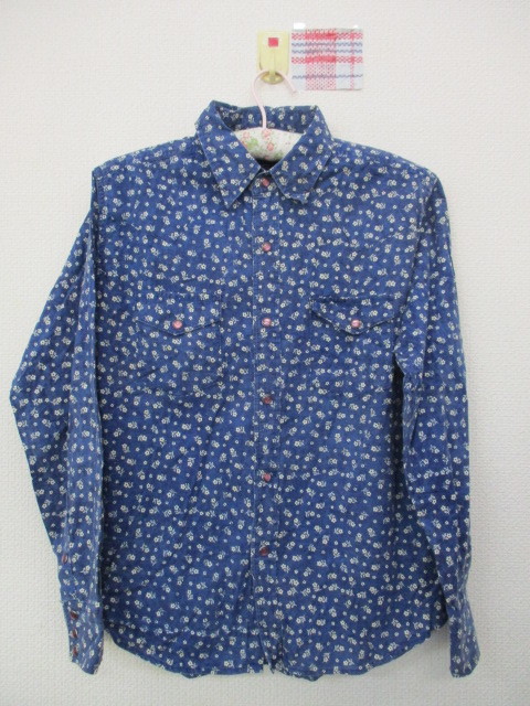 - ★famock メンズ長袖シャツ ブルー地に小花柄 ピンクボタン(S)
