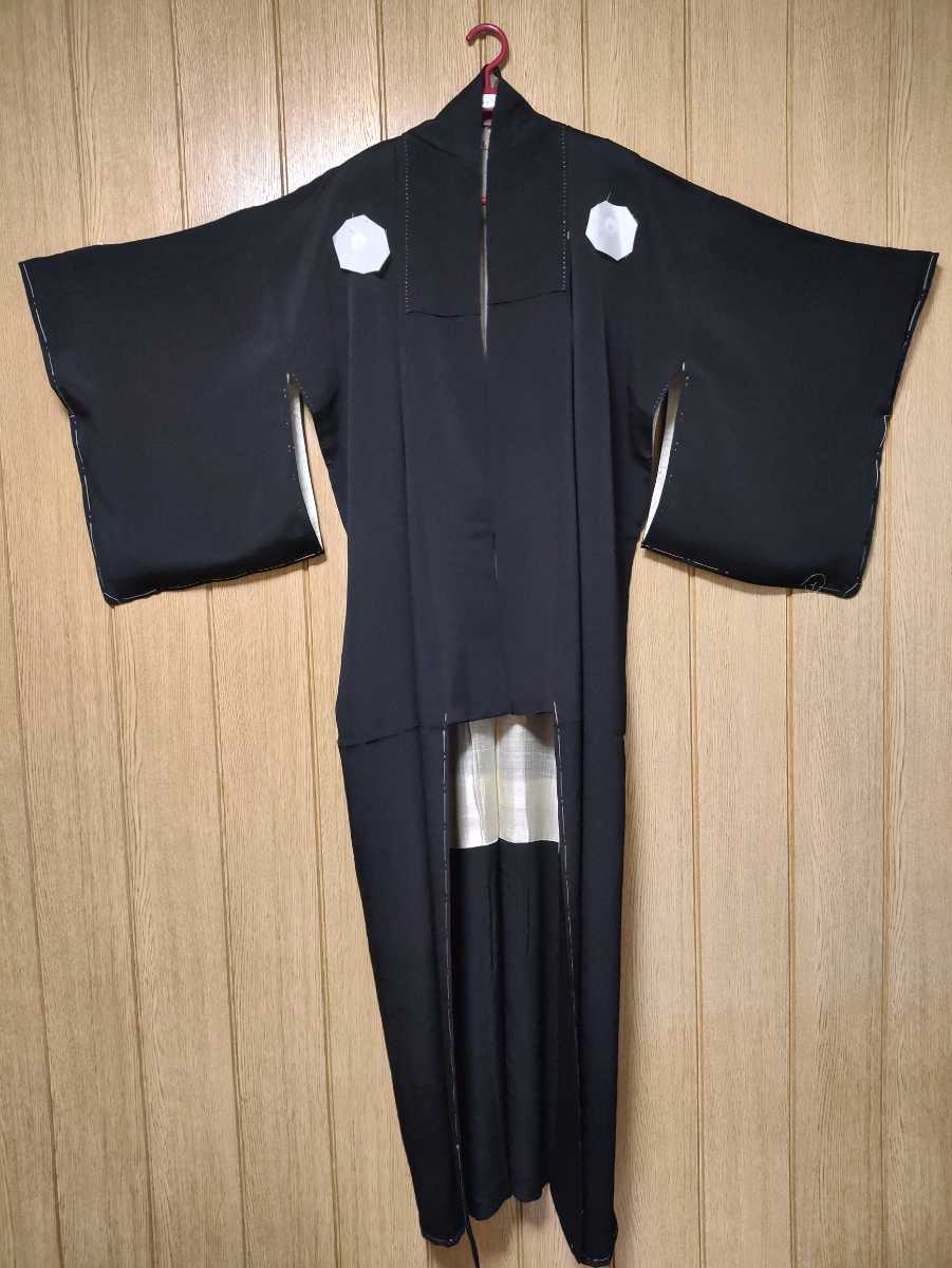 - 中古 リアル レトロ スタンダード 黒喪服 家紋 小紋 Vintage Kimono black formal for funeral with family emblem 着物 リメイク 生地