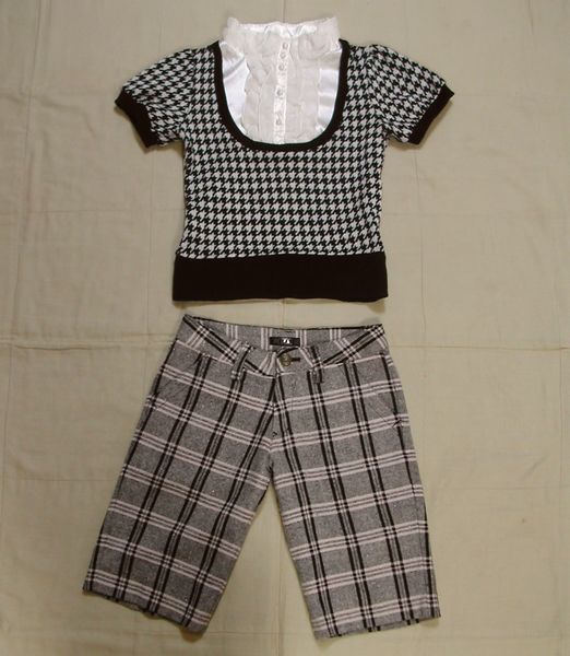 - ■美品:ブラウスとの重ね着風半袖セーターと膝丈パンツ M DmP95
