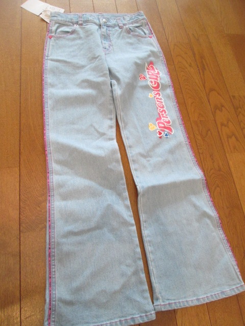 - 140 デニムパンツ ピンク英文字入り 薄いデニム色 新品未使用タグ付き