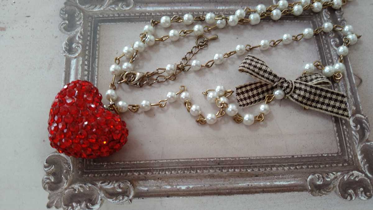 - □ぷっくりハート×赤ラインストーン&リボン・ロングネックレス□